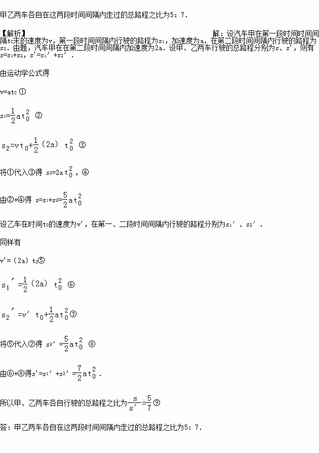 甲乙两辆汽车都从静止出发做加速直线运动,加速度方向一直不变.在第一段时间间隔内,两辆汽车的加速度大小不变,汽车乙的加速度大小是甲的两倍;在接下来的相同时间间隔内,汽车甲的加速度大小增加为原来的两倍,汽车乙的加速度大小减小为原来的一半.求甲乙两车各自在这两段时间间隔内走过的总路程之比.