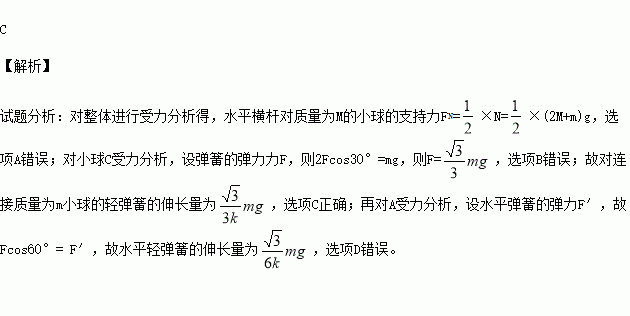 Á½¸öÖмäÓп׵ÄÖÊÁ¿ÎªMµÄСÇòA¡¢BÓÃÒ»Çᵯ»ÉÏàÁ¬£¬Ì×ÔÚˮƽ¹â»¬ºá¸ËÉÏ£®Á½¸öСÇòÏÂÃæ·Ö±ðÁ¬Ò»Çᵯ»É£®Á½Çᵯ»É϶ËϵÔÚÒ»ÖÊÁ¿ÎªmµÄСÇòCÉÏ£¬ÈçͼËùʾ£®ÒÑÖªÈý¸ùÇᵯ»ÉµÄ¾¢¶ÈϵÊý¶¼Îªk£¬Èý¸ùÇᵯ»É¸ÕºÃ¹¹³ÉÒ»µÈ±ßÈý½ÇÐΣ®ÏÂÁÐ˵·¨ÕýÈ·µÄÊÇ