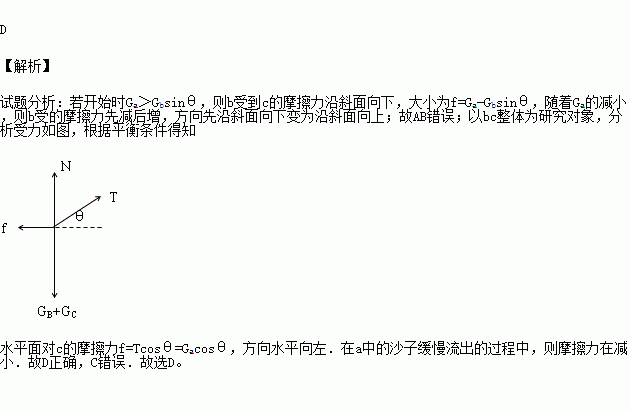 如图所示,倾角为θ的斜面体c置于水平地面上,小物块b置于斜面上, 通过细绳跨过光滑的定滑轮与沙漏a连接,连接b的一段细绳与斜面平行.在a中的沙子缓慢流出的过程中,a、b、c都处于静止状态,则( )