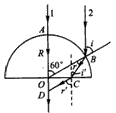 半径为R的玻璃半圆柱体,横截面如图所示,圆心为O。两条平行单色红光沿截面射向圆柱面,方向与底面垂直,光线1的入射点A为半圆柱的顶点,光线2的入射点为B,∠AOB=60°。已知该玻璃对红光的折射率n=