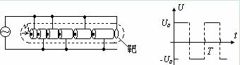 因此,人们就想利用较低的电压,采用多级加速使粒子加速到高能量,如图甲所示。N个长度逐个增大的金属圆筒和一个靶,它们沿轴线排列成一串,如图所示(图中只画出了六个圆筒,作为示意)。各筒和靶相间地连接到如图乙所示周期为T、电压值为U0的高频方波电源的两端。整个装置放在高真空容器中,圆筒的两底面中心开有小孔。带电粒子沿轴线射入圆筒,并将在圆筒间及圆筒与靶间的缝隙处受到电场力的作用而加速(设圆筒内部没有电场)。缝隙的宽度很小,粒子穿过缝隙的时间可以不计。