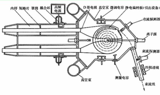 回旋加速器主要由圆柱形磁极、D形盒、高频交变电源、粒子源和引出装置组成,如图所示.其中D形盒装在真空室中,是回旋加速器的核心部件,整个真空室放在磁极之间,磁场方向垂直于D形盒,两个D形盒之间留一个窄缝,分别与高频电源的两极相连.当粒子经过D形盒之间的窄缝,得到高频电源的加速,在D形盒之间,由于屏蔽作用,盒内只有磁场分布,这样带电粒子在D形盒内沿螺线轨道运动,达到预期的速率后,用引出装置引出。