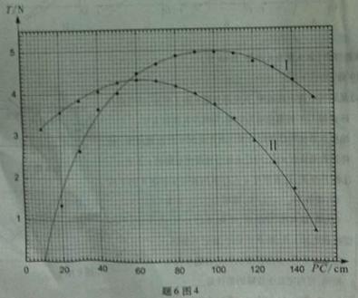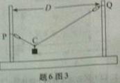 为了研究人们用绳索跨越山谷过程中绳索拉力的变化规律,同学们设计了如题6图3所示的实验装置。他们将不可伸长轻绳的两端通过测力计(不计质量及长度)固定在相距为D的两立柱上,固定点分别为P和Q,P低于Q,绳长为L(L>PQ)。他们首先在绳上距离P点10cm处(标记为C)系上质量为m的重物(不滑动),由测力计读出PC、QC的拉力大小TP、TQ。随后,改变重物悬挂点C的位置,每次将P到C的距离增加10cm,并读出测力计的示数,最后得到TP、TQ与绳长PC的关系曲线如题6图4所示。由实验可知: