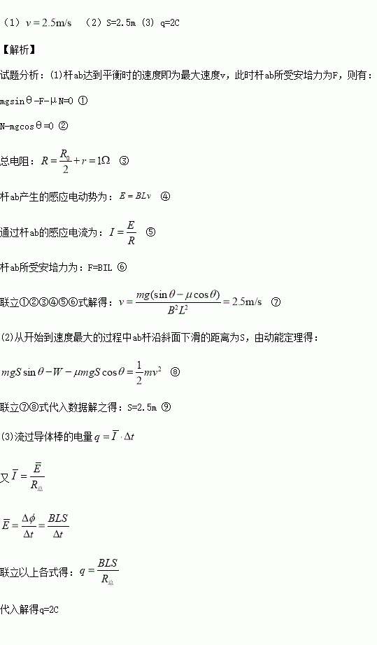 £¨13·Ö£©ÈçͼËùʾ£¬Ò»Æ½Ãæ¿ò¼ÜÓëË®Æ½Ãæ³É37¡ã½Ç£¬¿íL=0.4m,ÉÏ¡¢ÏÂÁ½¶Ë¸÷ÓÐÒ»¸öµç×èR0£½1¦¸,¿ò¼ÜµÄÆäËû²¿·Öµç×è²»¼Æ,¿ò¼Ü×ã¹»³¤.´¹Ö±ÓÚ¿òÆ½ÃæµÄ·½Ïò´æÔÚÏòÉϵÄÔÈÇ¿´Å³¡,´Å¸ÐӦǿ¶ÈB£½2T¡£abΪ½ðÊô¸Ë,Æä³¤¶ÈΪL£½0.4m£¬ÖÊÁ¿m£½0.8kg£¬µç×èr£½0.5¦¸£¬½ðÊô¸ËÓë¿ò¼ÜµÄ¶¯Ä¦²ÁÒòÊý¦Ì£½0.5¡£½ðÊô¸ËÓɾ²Ö¹¿ªÊ¼Ï»¬,Ö±µ½ËÙ¶È´ïµ½×î´óµÄ¹ý³ÌÖÐ,½ðÊô¸Ë¿Ë·þ´Å³¡Á¦Ëù×öµÄ¹¦ÎªW=1.5J¡£ÒÑÖªsin37¡ã£½0.6£¬cos37¡ã=0.8£»gÈ¡10m£¯s2.Çó: