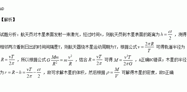 公元2100年,航天员准备登陆木星,为了更准确了解木星的一些信息,到木星之前做一些科学实验,当到达与木星表面相对静止时,航天员对木星表面发射一束激光,经过时间t,收到激光传回的信号,测得相邻两次看到日出的时间间隔是T,测得航天员所在航天器的速度为v,已知引力常量G,激光的速度为c,则( )