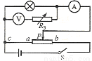 ,改装成的电压表的内阻远大于小灯泡的内阻,故采用安培表外接电路;因为采用分压电路,故滑动变阻器选用阻值较小的R2,电路如图;(3)实验中,变阻器滑动触头P在ab间移动时,发现小灯泡两端的电压只能在3.5V-6.0V间变化,即电压表的读数不能调节到0,说明滑动变阻器和电源及灯泡组成了串联限流电路,则电路中出现的故障可能是ac间断路;(4)若电压表V的实际阻值大于5kΩ,所以导致测量的灯泡的电压值偏大,即相同电流情况下,灯泡实际电压比测量值偏小,则小灯泡实际的伏安特性曲线应在所画图线的上方.(5)电路如图所示;在闭合电键之前滑片P应应置于a端.