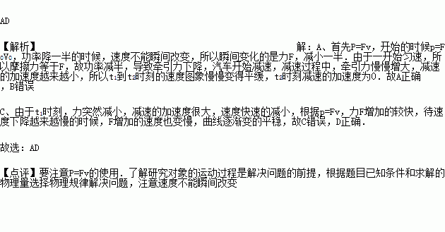 汽车在平直公路上以速度v0匀速行驶,发动机功率为P,牵引力为F0,t1时刻,司机减小了油门,使汽车的功率立即减小一半,并保持该功率继续行驶,到t2时刻,汽车又恢复了匀速直线运动.能正确表示这一过程中汽车牵引力F随时间t、速度v随时间t变化的图象是( )