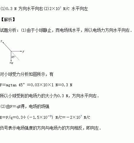 (12分)如图所示,一个质量m=30 g,带电量q=-1.5×10-8 C的半径极小的小球,用绝缘丝线悬挂在水平方向的匀强电场中.当小球静止时,测得悬线与竖直方向成45°夹角.求: