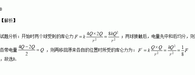 真空中两个完全相同、带异种电荷的导体小球A和B(视为点电荷),A带电荷量为+4Q,B带电荷量为-2Q,彼此间的引力为F.把两导体小球互相接触后再移回原来各自的位置,这时A 和B之间的作用力为F′,则F与F′之比为( )