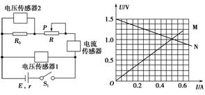 为了测定电源电动势E的大小、内电阻r和定值电阻R0的阻值,某同学利用DIS设计了如甲图所示的电路.闭合电键S1,调节滑动变阻器的滑动触头P向某一方向移动时,用电压传感器1、电压传感器2和电流传感器测得数据,并根据测量数据计算机分别描绘了如图乙所示的M、N两条U-I直线.请回答下列问题: