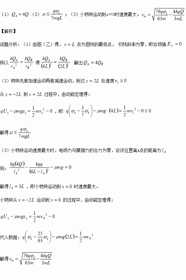 ÔÚ¾øÔµ´Ö²ÚµÄË®Æ½ÃæÉÏÏà¾àΪ6LµÄA.BÁ½´¦·Ö±ð¹Ì¶¨µçÁ¿²»µÈµÄÕýµçºÉ£¬Á½µçºÉµÄλÖÃ×ø±êÈçͼ£¨¼×£©Ëùʾ£¬ÒÑÖªB´¦µçºÉµÄµçÁ¿Îª+Q¡£Í¼£¨ÒÒ£©ÊÇABÁ¬ÏßÖ®¼äµÄµçÊÆ¦ÕÓëλÖÃxÖ®¼äµÄ¹ØÏµÍ¼Ïó£¬Í¼ÖÐx=LµãΪͼÏßµÄ×îµÍµã£¬x£½-2L´¦µÄ×Ý×ø±ê¦Õ=¦Õ0£¬x£½0´¦µÄ×Ý×ø±ê
