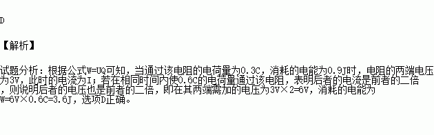 当电阻两端加上某一稳定电压时,通过该电阻的电荷量为0.3C,消耗的电能为0.9J。为在相同时间内使0.6C的电荷量通过该电阻,在其两端需加的电压和消耗的电能分别是