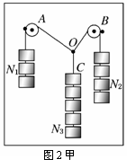 有同学利用如图2甲所示的装置来验证力的平行四边形定则。在竖直木板上铺有白纸,固定两个光滑的滑轮A和B,将绳子打一个结点O,在三段绳上分别挂上三组钩码,每个钩码的重量相等。当系统达到平衡时,根据钩码个数读出三根绳子的拉力。该学生根据某次测量的数据在白纸上画出了图2乙所示的五个力,以验证力的平行四边形定则,则