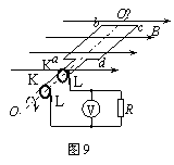 图9为一个小型交流发电机的原理图,其矩形线圈的面积为S,共有n匝,线圈总电阻为r,可绕与磁场方向垂直的固定对称轴OO′转动;线圈处于磁感应强度为B的匀强磁场中,线圈在转动时可以通过滑环K和电刷L保持与外电路电阻R的连接。在外力作用下线圈以恒定的角速度ω绕轴OO′匀速转动。(不计转动轴及滑环与电刷的摩擦)