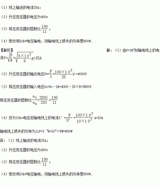(4)若改用10kV电压输电,则输电线上损失的功率是多大?
