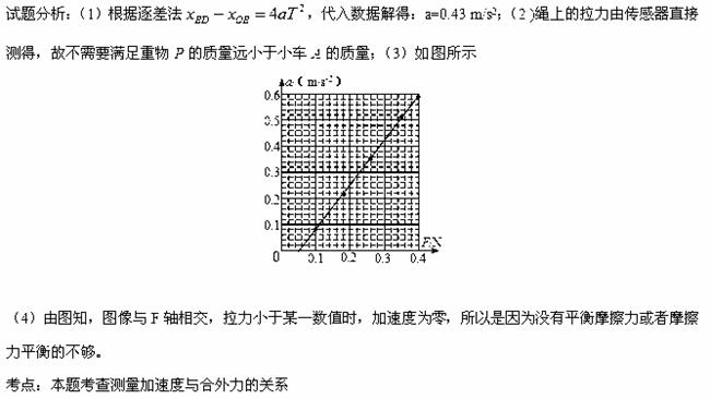 ijͬѧÓÃÈçͼËùʾµÄ×°ÖÃ̽¾¿Ð¡³µ¼ÓËÙ¶ÈÓëºÏÍâÁ¦µÄ¹ØÏµ¡£Í¼ÖÐС³µA×ó¶ËÁ¬½ÓÒ»Ö½´ø²¢´©¹ý´òµã¼ÆÊ±Æ÷BµÄÏÞλ¿×£¬ÓÒ¶ËÓÃÒ»ÇáÉþÈÆ¹ý»¬ÂÖϵÓÚÀÁ¦´«¸ÐÆ÷CµÄ϶ˣ¬A¡¢BÖÃÓÚˮƽ·ÅÖõÄÒ»¶Ë´øÓж¨»¬ÂÖµÄ×ã¹»³¤µÄľ°åÉÏ¡£²»¼ÆÉþÓ뻬ÂÖµÄĦ²Á¼°»¬ÂÖµÄÖÊÁ¿¡£ÊµÑéʱ£¬ÏȽÓͨµçÔ´ÔÙÊÍ·ÅС³µ£¬´òµã¼ÆÊ±Æ÷ÔÚÖ½´øÉÏ´òÏÂһϵÁе㡣¸ÃͬѧÔÚ±£Ö¤Ð¡³µAÖÊÁ¿²»±äµÄÇé¿öÏ£¬Í¨¹ý¸Ä±äPµÄÖÊÁ¿À´¸Ä±äС³µAËùÊܵÄÍâÁ¦£¬ÓÉ´«¸ÐÆ÷ºÍÖ½´ø²âµÃµÄÀÁ¦FºÍ¼ÓËÙ¶ÈaÊý¾ÝÈçϱíËùʾ¡£