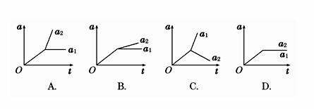 如图,在光滑水平面上有一质量为m1的足够长的木板,其上叠放一个质量为m2的木块。假定木块和木板之间的最大静摩擦力和滑动摩擦力相等。现给木块施加一随时间t增大的水平力F=kt(k是常数),木板和木块加速度的大小分别为a1和a2。下列反映a1和a2变化的图线中正确的是( )
