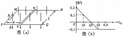 μ=0.1,导体棒垂直于导轨放在距离左端为d = 1. 0m处,导轨和导体棒始终接触良好, 电阻均忽略不计。整个装置处在范围足够大的匀强磁场中,t = 0时刻,磁场方向竖直向下,此后,磁感应强度B随时间t的变化如图(b)所示,不计感应电流磁场的影响。取重力加速度g =10m/s2。