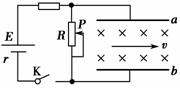 如图,电源电动势为E,内阻为r,滑动变阻器电阻为R,开关闭合。两平行极板间有匀强磁场,一带电粒子正好以速度v匀速穿过两板。以下说法正确的是(忽略带电粒子的重力)( )