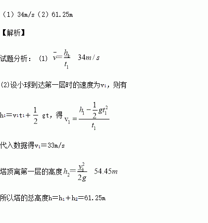 比萨斜塔是世界建筑史上的一大奇迹。如图所示,已知斜塔第一层离地面的高度h1=6.8m,为了测量塔的总高度,在塔顶无初速度释放一个小球,小球经过第一层到达地面的时间t1=0.2s,重力加速度g取10m/s2,不计空气阻力。