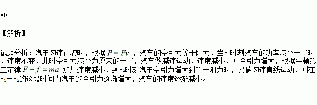 汽车以额定功率在平直公路上匀速行驶,t1时刻司机减小了油门,使汽车的功率立即减小一半,并保持该功率继续行驶,到t2时刻汽车又开始做匀速直线运动(设整个过程中汽车所受的阻力不变)。则在t1—t2的这段时间内