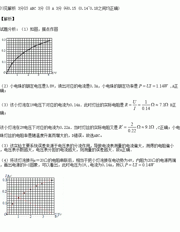 (4)若将该灯泡接与r=20Ω的电阻串联后接在U0=4V的电压两端,其实际功率是 W