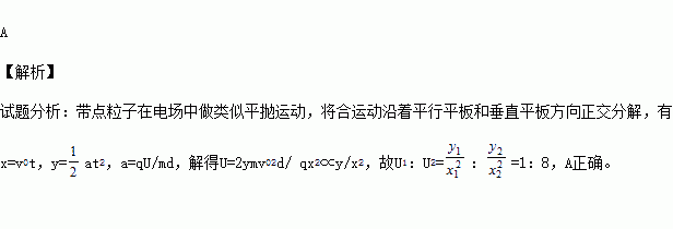 如图所示,有一带电粒子贴着A板沿水平方向射入匀强电场,当偏转电压为U1时,带电粒子沿①轨迹从两板正中间飞出;当偏转电压为U2时,带电粒子沿②轨迹落到B板中间;设粒子两次射入电场的水平速度相同,则两次偏转电压之比为( )