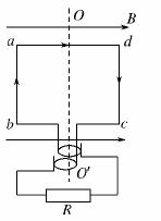 如图所示, N=50匝的矩形线圈abcd,边长ab="20" cm,ad="25" cm,放在磁感强度B="0.4" T的匀强磁场中,外力使线圈绕垂直于磁感线且通过线圈中线的OO′轴以n="3000" r/min的转速匀速转动,线圈电阻r="1" Ω,外电路电阻R="9" Ω,t=0,线圈平面与磁感线平行,ab边正好转出纸外、cd边转入纸里.