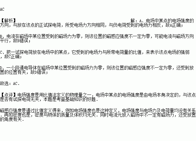 D£®°ÑһС¶Îͨµçµ¼Ïß·ÅÔڴų¡ÖÐij´¦£¬ËüËùÊܵĴų¡Á¦Óë¸ÃС¶Îͨµçµ¼Ïߵij¤¶ÈºÍµçÁ÷µÄ³Ë»ýµÄ±ÈÖµ±íʾ¸Ã´¦´Å³¡µÄÇ¿Èõ