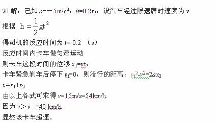 某司机乙驾驶一辆卡车正以一定速度在平直公路上匀速行驶.经过图a所示的限速牌标志为40km/h的位置时,突然发现离它25.5m处停着一辆正在维修的小轿车时,该司机采取了紧急刹车措施,使卡车做匀减速直线运动,结果还是与小轿车发生了碰撞.在处理事故时,交警甲用课本介绍的测定反应时间的方法对该司机乙进行了测试(如图b),发现他握住木尺时,木尺已经自由下降了20cm,试通过计算帮助交警分析卡车是否超速?(g取10m/s2)已知这种汽车急刹车时产生的加速度大小为5m/s2.