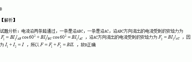 如图所示,一个边长L、三边电阻相同的正三角形金属框放置在磁感应强度为B的匀强磁场中。若通以图示方向的电流(从A点流入,从C点流出),电流为I,则金属框受到的磁场力的合力为