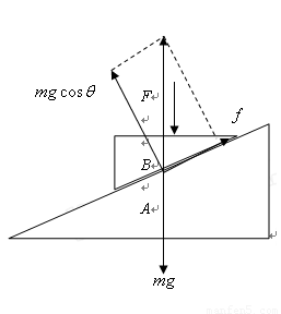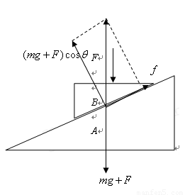 如图所示,质量为M的三棱柱B放在斜面A上静止不动。若在三棱柱B上施加一竖直向下的恒力F,下列说法正确的是