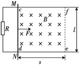 如图所示,光滑的平行金属导轨水平放置,电阻不计,导轨间距为l,左侧接一阻值为R的电阻.区域cdef内存在垂直轨道平面向下的有界匀强磁场,磁场宽度为s.一质量为m、电阻为r的金属棒MN置于导轨上,与导轨垂直且接触良好,受到F=0.5v+0.4(N)(v为金属棒速度)的水平外力作用,从磁场的左边界由静止开始运动,测得电阻两端电压随时间均匀增大.(已知:l=1 m,m=1 kg,R=0.3 Ω,r=0.2 Ω,s=1 m)