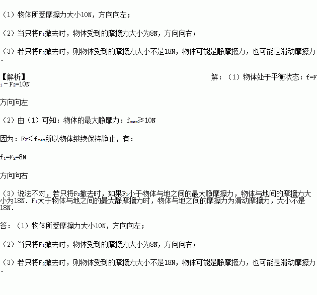 (3)若只将F2撤去时,则物体受到的摩擦力大小为18N,对吗?为什么?