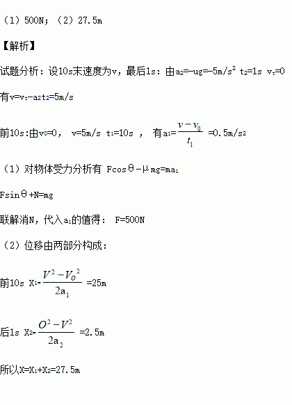 如图所示,一质量为m=100kg的箱子静止在水平面上,与水平面间的动摩擦因素为μ=0.5。现对箱子施加一个与水平方向成θ=37°角的拉力,经t1=10s后撤去拉力,又经t2=1s箱子停下来。sin37°=0.6,cos37°=0.8,g=10m/s2。求: