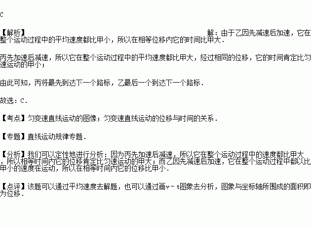甲、乙、丙三辆汽车以相同的速度同时经过某一路标,以后甲车一直做匀速直线运动,乙车先减速后加速,丙车先加速后减速,它们经过下一路标时的速度又相同则( )