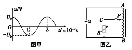 一理想自耦变压器的原线圈接有正弦交变电压如图甲所示,副线圈接有可调电阻R,触头P与线圈始终接触良好,如图乙所示,下列判断正确的是