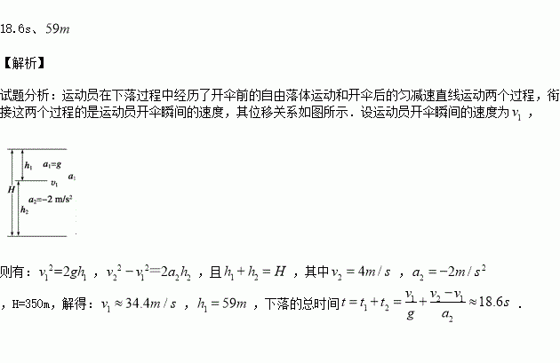 跳伞运动员从350m的高空离开直升机,自由下落一段距离后才打开降落伞,设开伞后以2 m/s2的加速度匀减速下降,到达地面的速度为4 m/s,求他下落的总时间及自由下落的距离.(g取10 m/s2)
