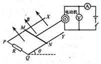 如图,电阻不计的足够长的平行光滑金属导轨PX、QY相距L=0.5m,底端连接电阻R=2Ω,导轨平面倾斜角θ=30°,匀强磁场垂直于导轨平面向上,磁感应强度B=1T。质量m=40g、电阻R=0.5Ω的金属棒MN放在导轨上,金属棒通过绝缘细线在电动机牵引下从静止开始运动,经过时间t1=2s通过距离x=1.5m,速度达到最大,这个过程中电压表示数U0=8.0V,电流表实数I0=0.6A,示数稳定,运动过程中金属棒始终与导轨垂直,细线始终与导轨平行且在同一平面内,电动机线圈内阻r0=0.5Ω,g=10m/s2.。求: