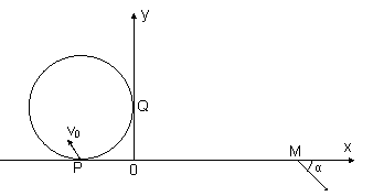 如图所示,在xoy平面的第II象限内有半径为R的圆分别与x轴、y轴相切于P、Q两点,圆内存在垂直于xoy面向外的匀强磁场。在第I象限内存在沿轴y负方向的匀强电场,电场强度为E。一带正电的粒子(不计重力)以速率v0从P点射入磁场后恰好垂直y轴进入电场,最后从M(3R,0)点射出电场,出射方向与x轴正方向夹角为α,且满足α=45°,求: