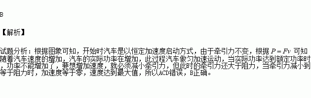 汽车发动机的额定功率为Pm,它在水平路面上行驶时受到的阻力大小恒定。若汽车在水平路面上由静止开始作直线运动,发动机输出功率P随时间t变化的图象如图所示,则