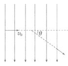 。若在同样的水平宽度范围内,不存在电场,而有方向垂直纸面的向外的匀强磁场(图中未画出),使该粒子仍以初速度v0垂直左边界、垂直磁场进入磁场,穿过磁场区域,使粒子的速度偏转角也为