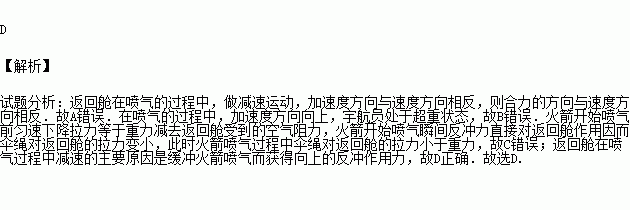D£®·µ»Ø²ÕÔÚÅçÆø¹ý³ÌÖмõËÙµÄÖ÷ÒªÔÒòÊÇ»º³å»ð¼ýÅçÆø¶ø»ñµÃÏòÉϵķ´³å×÷ÓÃÁ¦