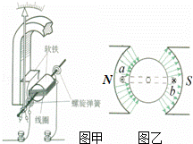 实验室经常使用的电流表是磁电式仪表.这种电流表的构造如图甲所示.蹄形磁铁和铁芯间的磁场是均匀地辐向分布的.当线圈通以如图乙所示的稳恒电流(b端电流流向垂直纸面向内),下列说法正确的是( )