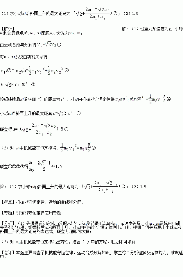 如图所示,左侧为一个半径为R的半球形的碗固定在水平桌面上,碗口水平,O点为球心,碗的内表面及碗口光滑.右侧是一个固定光滑斜面,斜面足够长,倾角θ=30°.一根不可伸长的不计质量的细绳跨在碗口及光滑斜面顶端的光滑定滑轮两端上,线的两端分别系有可视为质点的小球m1和m2,且m1>m2.开始时m1恰在右端碗口水平直径A处,m2在斜面上且距离斜面顶端足够远,此时连接两球的细绳与斜面平行且恰好伸直.当m1由静止释放运动到圆心O的正下方B点时细绳突然断开,不计细绳断开瞬间的能量损失.