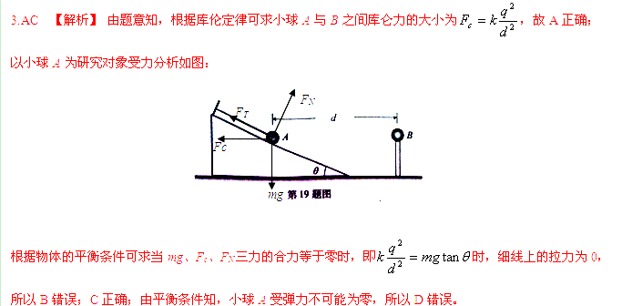 如图所示,水平地面上固定一个光滑绝缘斜面,斜面与水平面的夹角为θ。一根轻质绝缘细线的一端固定在斜面顶端,另一端系有一个带电小球A,细线与斜面平行。小球A的质量为m、电量为q。小球A的右侧固定放置带等量同种电荷的小球B,两球心的高度相同、间距为d。静电力常量为k,重力加速度为g,两带电小球可视为点电荷。小球A静止在斜面上,则( )