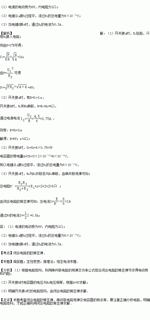 (3)当电键K接c时,通过R2的电流.