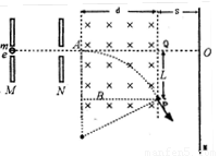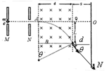 如图所示。电子自静止开始经M、N板间(两板间的电压为U)的电场加速后从A点垂直于磁场边界射入宽度为d的匀强磁场中,电子离开磁场时的位置P偏离入射方向的距离为L,在距离磁场边界S处有屏幕N,电子射出磁场后打在屏上。(已知电子的质量为m,电量为e)求: