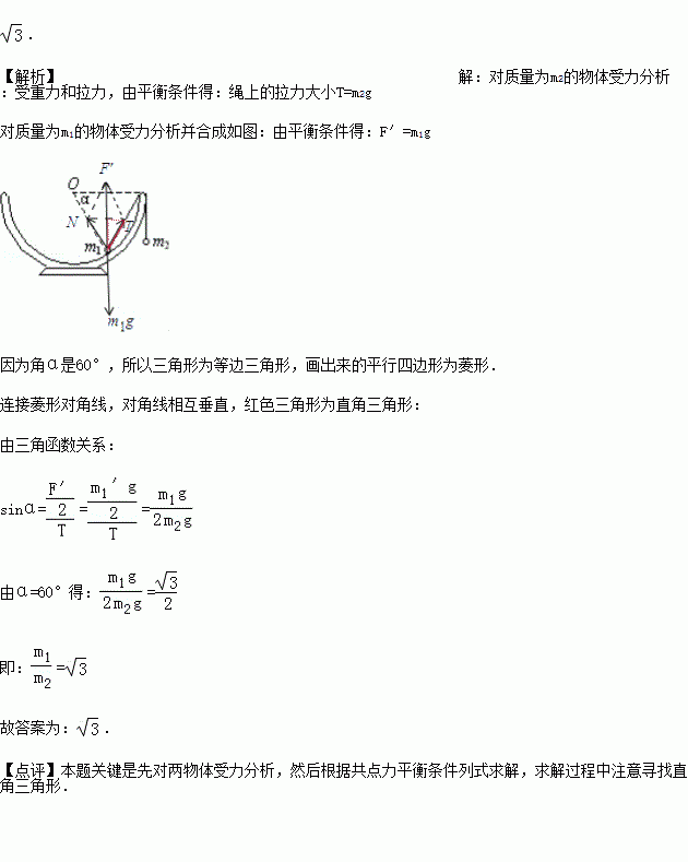 一个半球形的碗放在桌面上,碗口水平,O点为其球心,碗的内表面及碗口是光滑的.一根细线跨在碗口上,线的两端分别系有质量为m1和 m2的小球,当它们处于平衡状态时,质量为m1的小球与O点的连线与水平线的夹角为α=60°.求两小球的质量之比