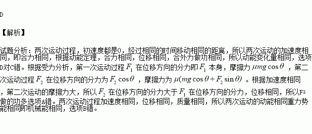 如图所示,分别用恒力F1、F2先后将质量为m的同一物体由静上开始沿相同的固定粗糙斜面由底端推至顶端。第一次力F1沿斜面向上,第二次力F2沿水平方向,两次所用时间相同,则在这两个过程中
